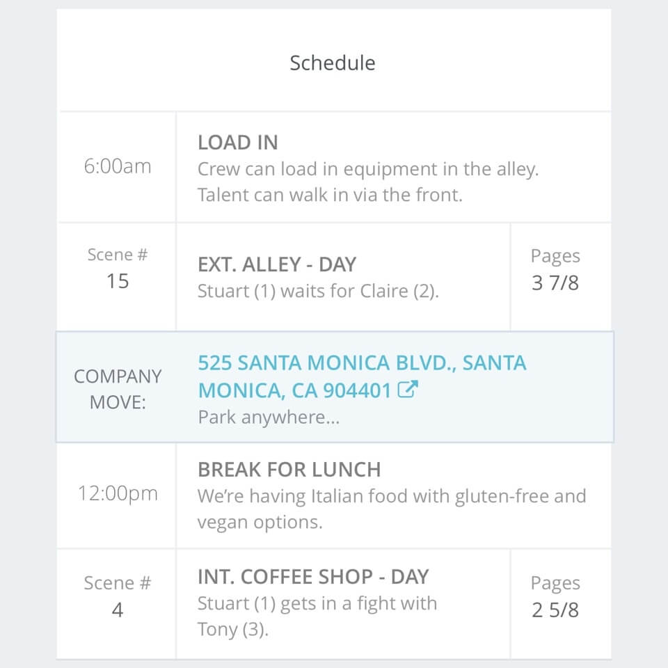 Locations are linked to Google Maps and the weather is up-to-the-minute accurate. Attach files like script sides, shot lists, or storyboards.